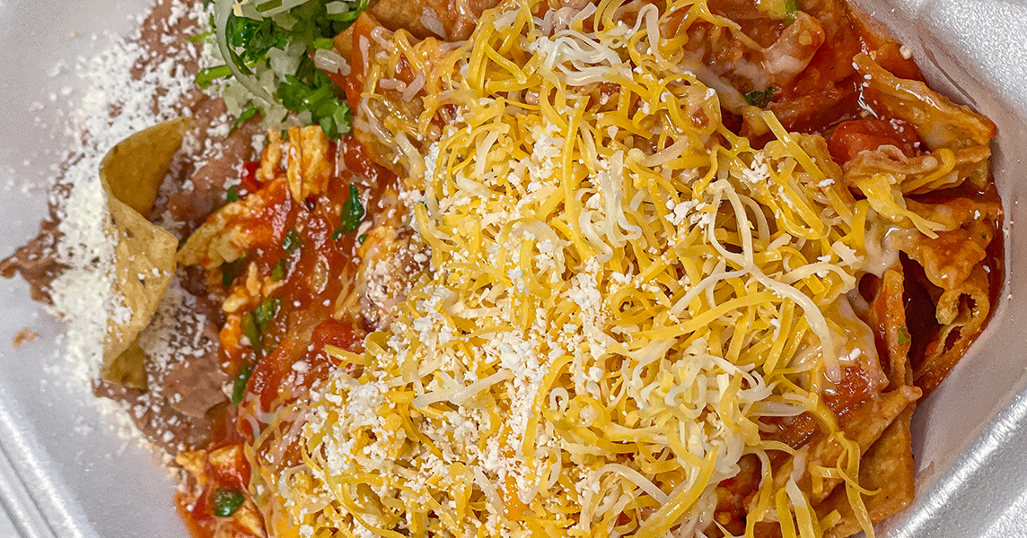 Traditional Mexican dish of fried tortilla strips simmered in a spicy red salsa topped with cheese and garnished with sour cream, onion & cilantro. Served with eggs (scrambled) and a side of beans.